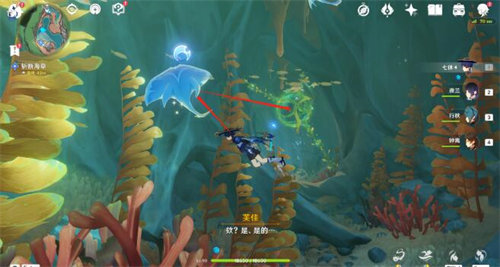 2、接着玩家需要找美露莘,在指引点跳入水里过剧情,先打鱼吸收它的能力再打海草球,打掉连接球的3根海草上的亮点即可。