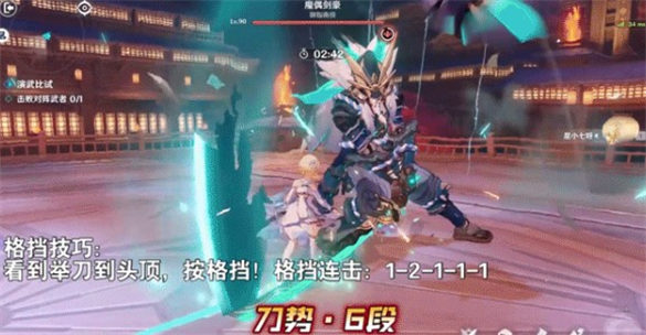 格挡技巧:一共是6段攻击,看到刀举到头顶,按格挡,注意格挡节奏:1-2-1-1-1(数字代表格挡连按次数。)
