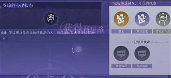2:然后就是第二关案发前罗琼的情况选择展会情况加上罗琼访谈,罗琼的心里状态选择罗琼的作品,罗琼案件矛盾点,选择罗琼亲笔加上签名;