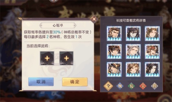 在三顾茅庐中玩家可以在左侧先选择自己心仪的武将,这样的话你就可以看到右方有你的心愿武将在卡池中了,因此只要你抽卡遇到的神将则必定是你心仪的那个,但是缺点是抽中的其他卡片则是一些将魂和物品,也无法获得其他的良将和名将,但大家不缺这些将的话选择这个就行抽取还是很值得的,因为里面的一些道具例如高级神锻石等都是比较稀缺的资源用来锻造神兵的。