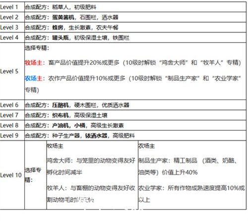耕种:可以通过收获农作物、照顾动物来获取经验值。每级都会增加1点锄头和喷壶的专精。